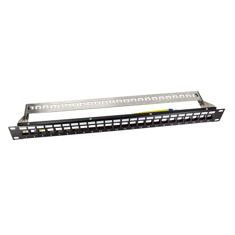 The snap-in type Patch Panels fits in all standard 19” racks or enclosures and includes built-in rear cable management (support bar) to enable you to efficiently organize the bulk cables. This High Density 24-port patch panel allows media to be integra